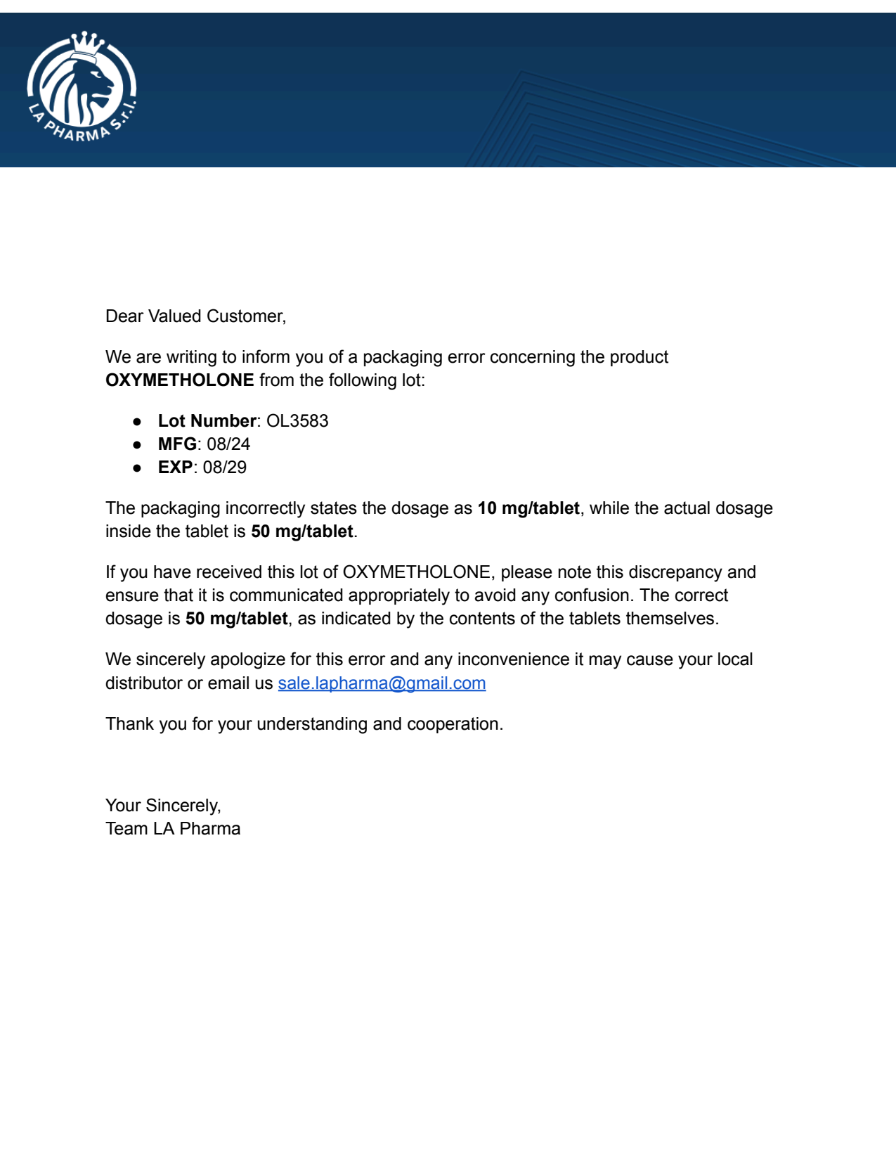 OXYMETHOLONE Packaging Error